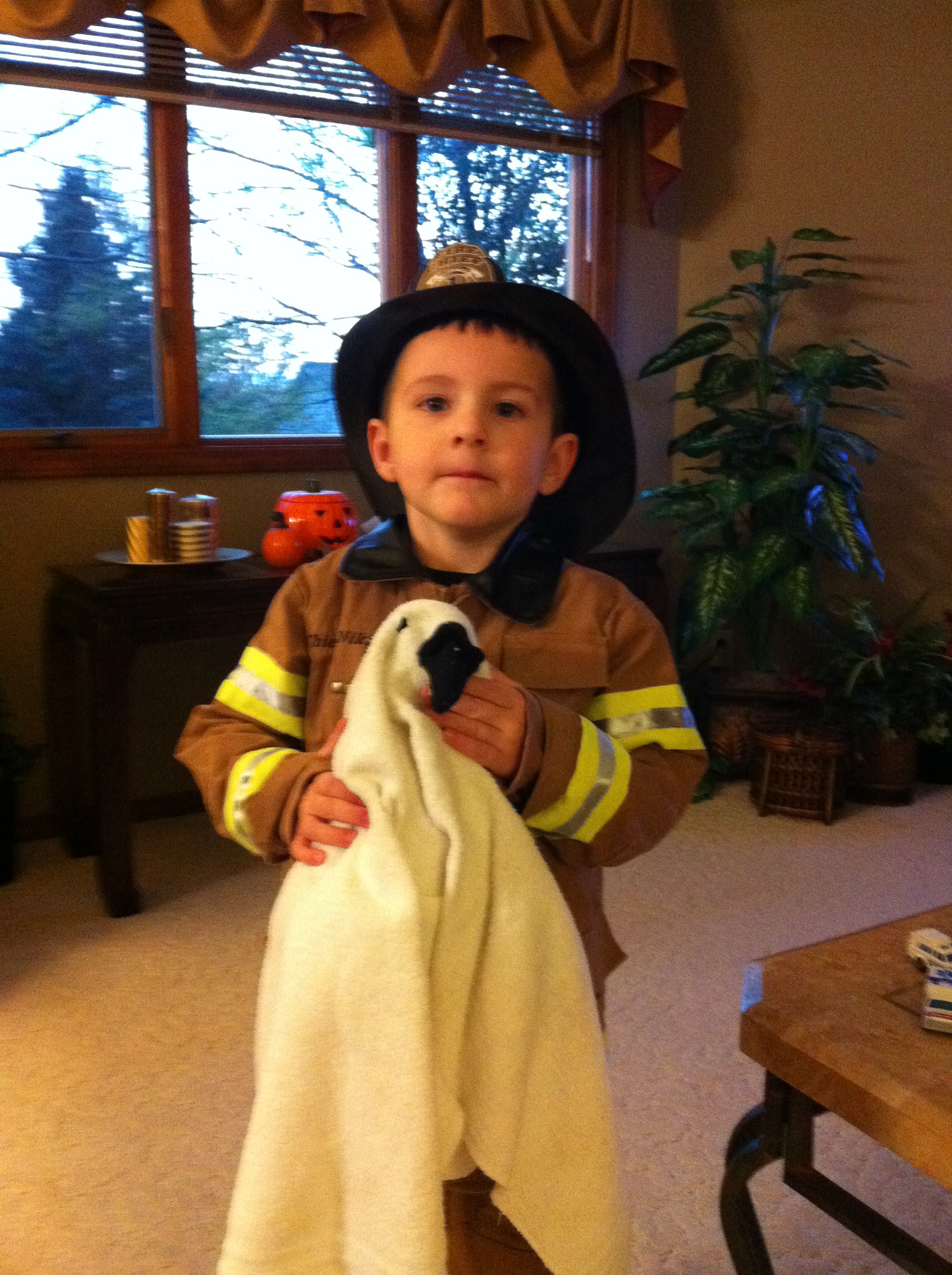Niklas is apparently frightened of Flippy's scary ghost costume. That, or he has no interest in having his pictue taken.