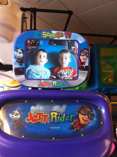 Niklas and Aaron are not as enthused about this Chuck E Cheese ride as the animated cat promised they would be.