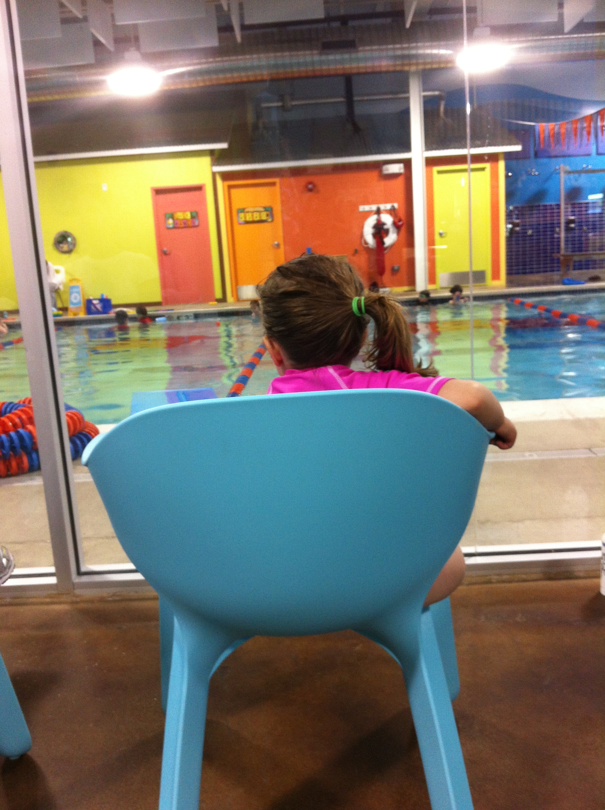 Here's Zoe waiting patiently for her turn in the pool while sporting a woefully off center pony tail that I may be responsible for.